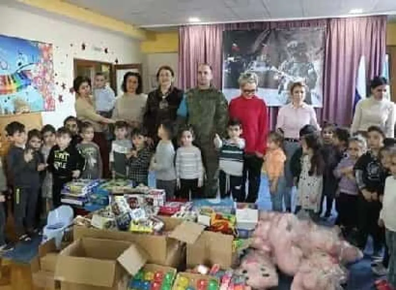 Ռուս խաղաղապահները բարերարների հետ միասին մանկապարտեզի միջոցառումների դահլիճում փափուկ եւ ուսումնական խաղալիքներ, ինչպես նաեւ գրենական պիտույքներ են հանձնել եւ նվիրել 100-ից ավելի երեխաների:
