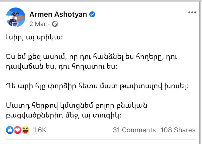 Արմեն Աշոտյանը ֆեյսբուքյան իր էջում տարածել է իր նախկին այս գրառումը՝ գրելով․ «Այս գրառման համար այսօր հրավիրվել էի Էրեբունու ոստիկանության բաժին՝ «վիրավորանքի» տխրահռչակ հոդվածով։