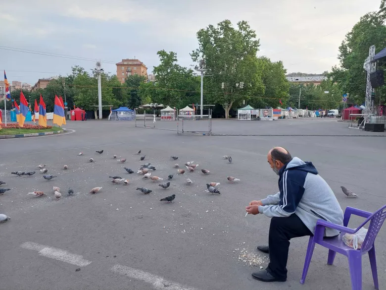 Արևի առաջին ճառագայթների ներքո աղավնիները հավաքվեցին հրապարակի կենտրոնում, որտեղ նրանց կերակրում էր ցուցարարներից մեկը: Արամ Խաչատրյանի, Կոմիտասի եւ Սարյանի արձանները աստիճանաբար արթնանում էին գիշերվա խաղաղ քնից եւ բարի լույս մաղթում միմյանց եւ հայ ազգին։