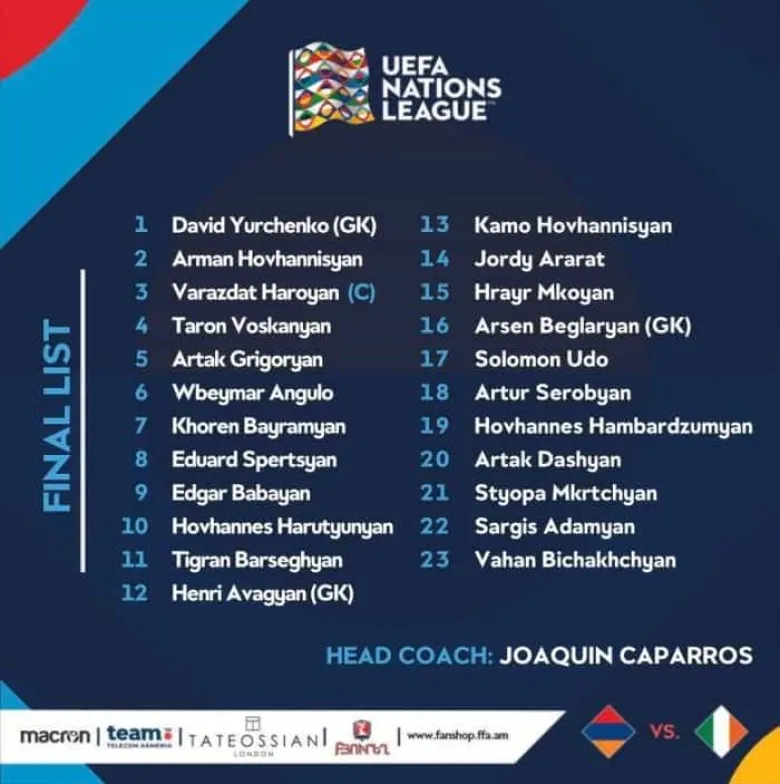 Ֆուտբոլի Հայաստանի ազգային հավաքականի իսպանացի գլխավոր մարզիչ Խոակին Կապառոսը հրապարակել է թիմի վերջնական հայտացուցակը Իռլանդիայի դեմ Ազգերի լիգայի առաջին խաղի համար։