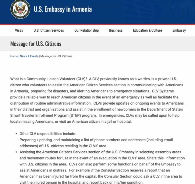 Հայաստանում ԱՄՆ դեսպանատունը հայտարարություն է տարածել, որում նշվում է, որ կամավորների են հավաքագրում արտակարգ իրավիճակներում ԱՄՆ քաղաքացիներին հայտնաբերելու, էվակուացնելու ու վնասվածքների մասին հաղորդումներ տալու համար։