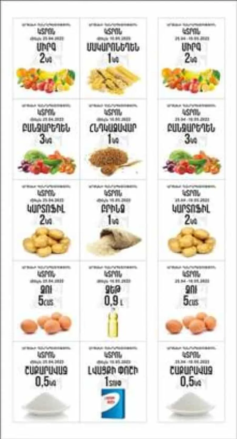 Իսկ Հանրապետության մյուս համայնքների բնակիչները կտրոնները կարող են ստանալ ապրիլի 5-ից՝ համայնքային կենտրոններից: Հորդորում ենք տեղամասեր այցելելուց առաջ ճշտել տվյալ հասցեների էլեկտրաէներգիայի հովհարային անջատման գրաֆիկը: Հայտնում ենք նաև, որ վաղվանից մայրաքաղաքի և Մարտակերտի շրջանի խանութներին կմատակարարվեն բանջարեղեն՝ գազար, բազուկ, կաղամբ, սոխ, իսկ հաջորդող օրերին՝ նաև վարունգ ու լոլիկ: Ասկերանի և Մարտունու շրջանների խանութներին մատակարարումները կիրականացվեն ապրիլի 4-ից և 5-ից սկսած: Հիշեցնենք, որ այն քաղաքացիները, որոնք չեն օգտագործել նախկինում ստացած կտրոնները, գնումներ կատարելու համար կարող են դրանք օգտագործել մինչև ապրիլի 10-ը՝ միաժամանակ հնարավորություն ունենալով նաև ստանալու նոր կտրոններ: