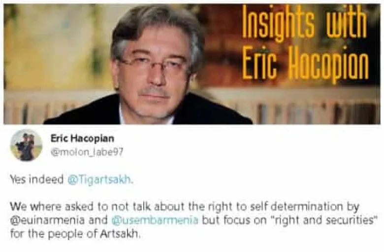 «Հայաստանում ԱՄՆ դեսպանատնից ու Հայաստանում Եվրոմիության գրասենյակից մեզ ասել են չխոսել Արցախի ինքնորոշման իրավունքից, այլ միայն «իրավունքից և անվտանգությունից»»։