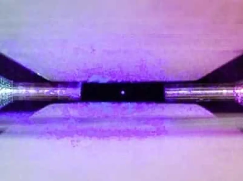 Այնուհետև միաիոնային խցիկ է օգտագործվել ատոմն իոնային ճառագայթով լուսավորելու համար, որպեսզի այն տեսանելի լինի: Լուսանկարում այն կարծես փոքրիկ վառ կապույտ կետ լինի, որը կախված է վակուումում երկու էլեկտրոդների միջև: Ուշադրություն դարձրեք, որ լուսանկարն արվել է սև և սպիտակ տարբերակով, այնուհետև այն գունավորվել է, որպեսզի ավելի լավ ընդգծվի ստրոնցիումի ատոմը: