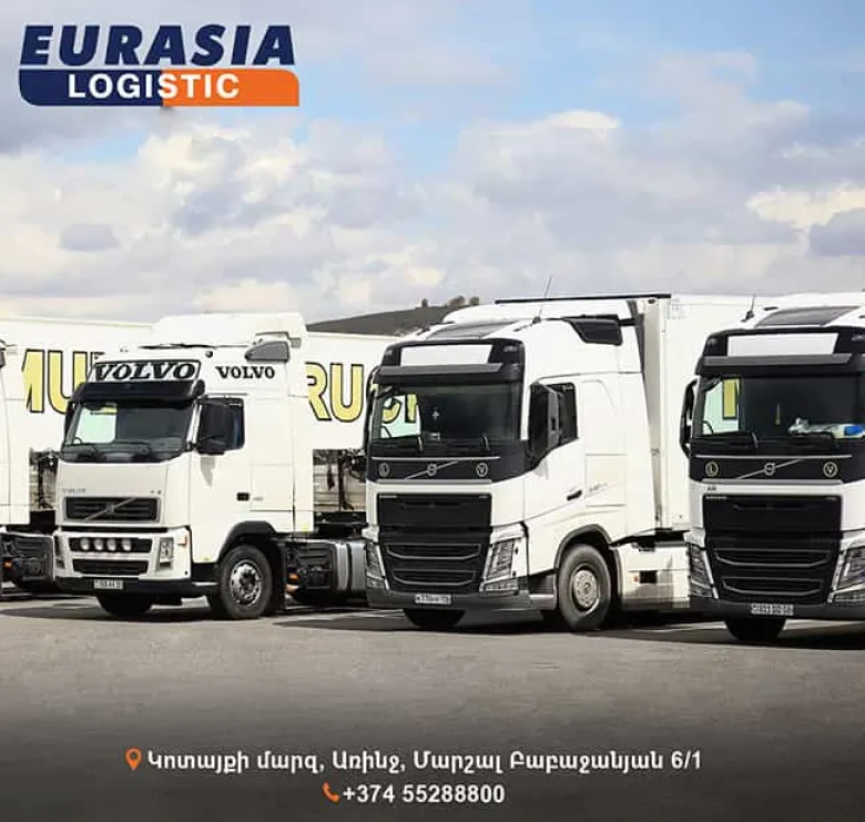 Եվրասիա լոգիստիքը բեռնափոխադրումներով զբաղվող ընկերություն է, որը ձեր ցանկացած ծավալի բեռ ժամանակին, պարտաճանաչորեն և հուսալիորեն կհասցնի ինչպես Հայաստանի մարզեր, այնպես էլ եվրոպական և ԱՊՀ երկրներ: Կազմակերպության շարժակազմը համալրված է VOLVO մակնիշի ավելի քան 30 փոխադրամիջոցով, որոնք համապատասխանում են միջազգային ստանդարտներին, վերազինված են կապի և վերահսկման նորագույն համակարգերով ,դրանցում առկա են ջերմասենսորներ, որոնք թույլ են տալիս տվյալ բեռի փոխադրման համար սահմանել պահանջվող համապատասխան ջերմաստիճանը և ճանապարհ դուրս գալ: