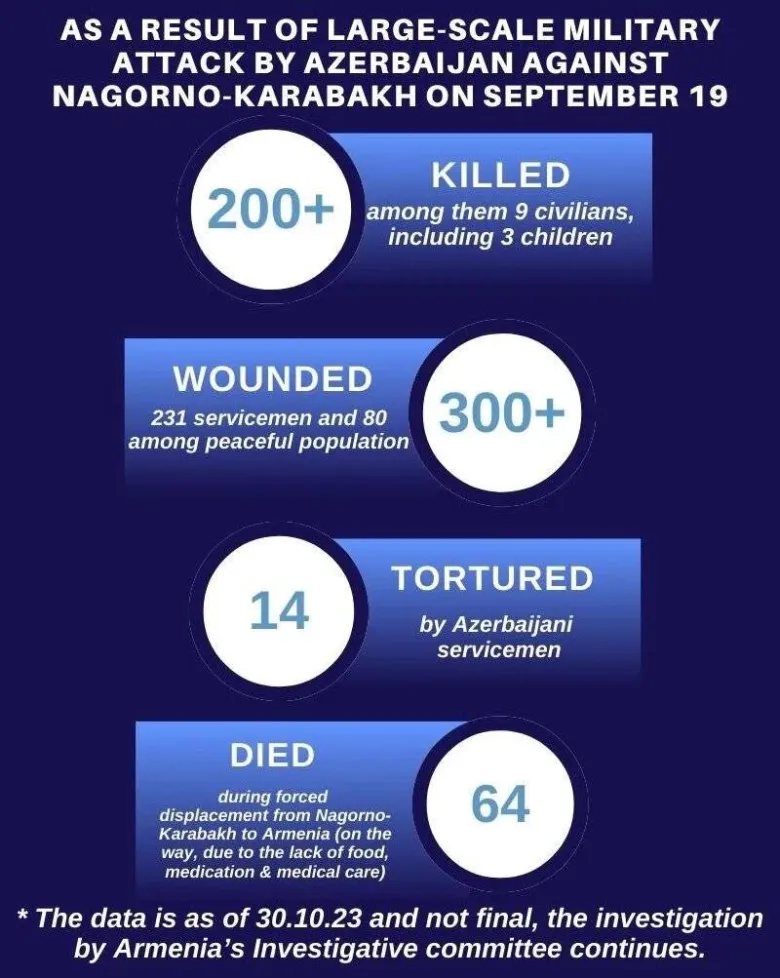 «ՀՀ քննչական կոմիտեն հրապարակել է տվյալներ սեպտեմբերի 19–ին Լեռնային Ղարաբաղի վրա Ադրբեջանի սանձազերծած լայնածավալ ռազմական հարձակման հետևանքով զոհվածների և վիրավորների, այդ թվում՝ խաղաղ բնակիչների, մասնավորապես երեխաների թվի մասին»,– գրել է նա: