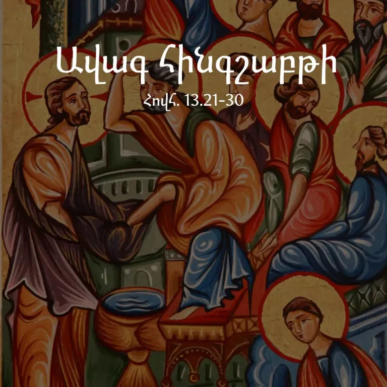 Ավագ հինգշաբթի օրը Տերը գալիս է Վերնատուն, որը Եկեղեցու օրինակն է, այնտեղ ուտում զատկական գառը, լվանում է Իր աշակերտների ոտքերը, նրանց հաղորդ դարձնում Իր Մարմնին ու Արյանը՝ այսպիսով հաստատելով Ս. Հաղորդության խորհուրդը, իսկ գիշերը ելնում է Ձիթենյաց լեռ, Իր աստվածային գլուխը գետին խոնարհելով՝ աղոթում Հորը և ապա ձերբակալվում (Մատթ. 26:17-46): Տերը նախ լվաց աշակերտների ոտքերը, ապա տվեց Իր Մարմինն ու Արյունը՝ կամենալով նախ սրբել նրանց ադամական մեղքից և հետո տալ Ս. Հաղորդության խորհուրդը: