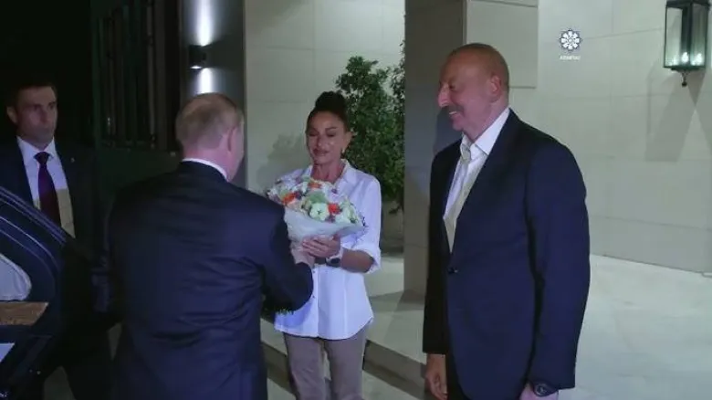 Համացանցում տարածված կադրերում երևում է, թե ինչպես են Ալիևները ջերմորեն ողջագուրվում Պուտինի հետ. վերջինս համբուրում է Մեհրիբան Ալիևային և նրան ծաղկեփունջ նվիրում: