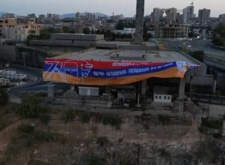Երևանում երիտասարդները Հայաստանի Հանրապետության և Արցախի Հանրապետության հսկայական դրոշն են ծածանել Կասկադի վերին հատվածում՝ «Վերածնված Հայաստան» կոթողի մոտ։