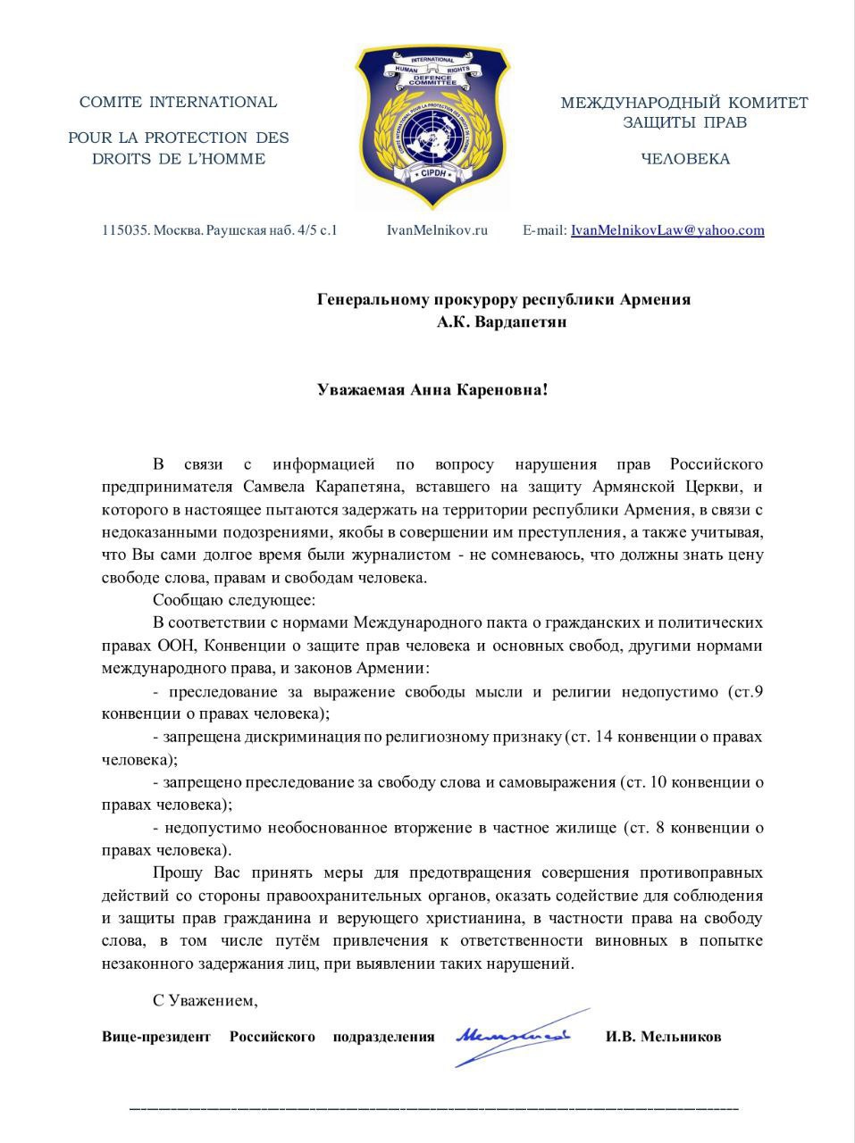 Մարդու իրավունքների պաշտպանության միջազգային կոմիտեն դիմել է ՀՀ գլխավոր դատախազին Սամվել Կարապետյանի իրավունքները պաշտպանելու խնդրանքով