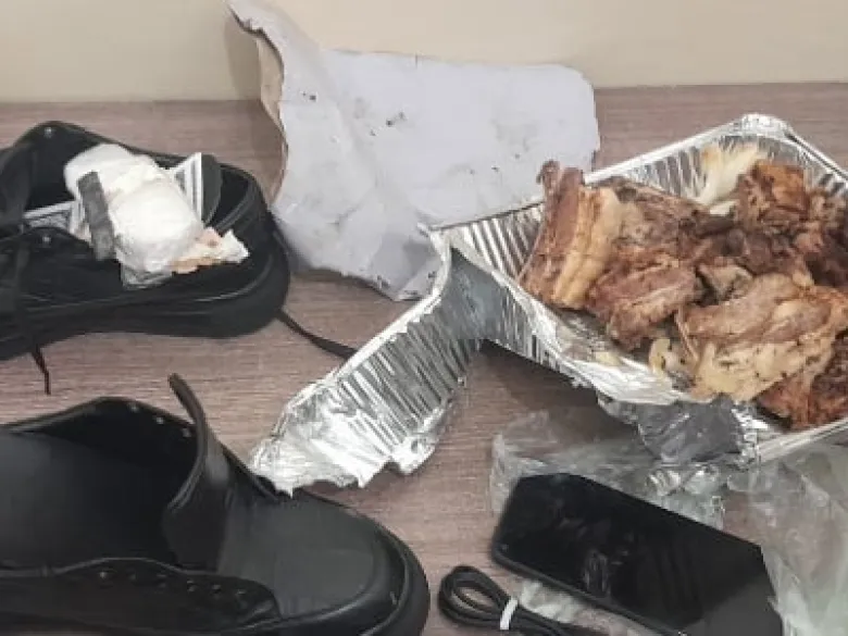 Մասնավորապես՝ կալանավորված անձի մոտ առկա սննդամթերքի տարայում պատրաստված թաքստոցից հայտնաբերվել են բջջային հեռախոս՝ բաժանորդային քարտով, և լիցքավորման լար, իսկ նրա հագին եղած կոշիկների ներբաններից հայտնաբերվել են թմրամիջոցի նմանվող դեղնականաչավուն բուսական զանգված՝ ընդհանուր 27,4 գրամ քաշով, և բյուրեղանման փոշեզանգված՝ 2,3 գրամ քաշով, ինչպես նաև 34 հատ գործարանային արտադրության խաղաթուղթ։