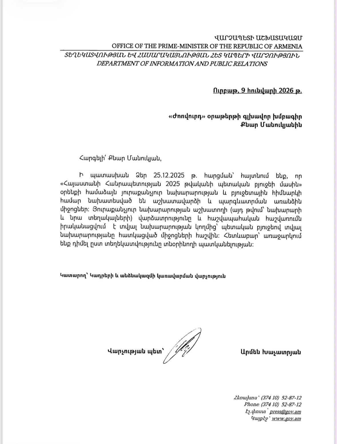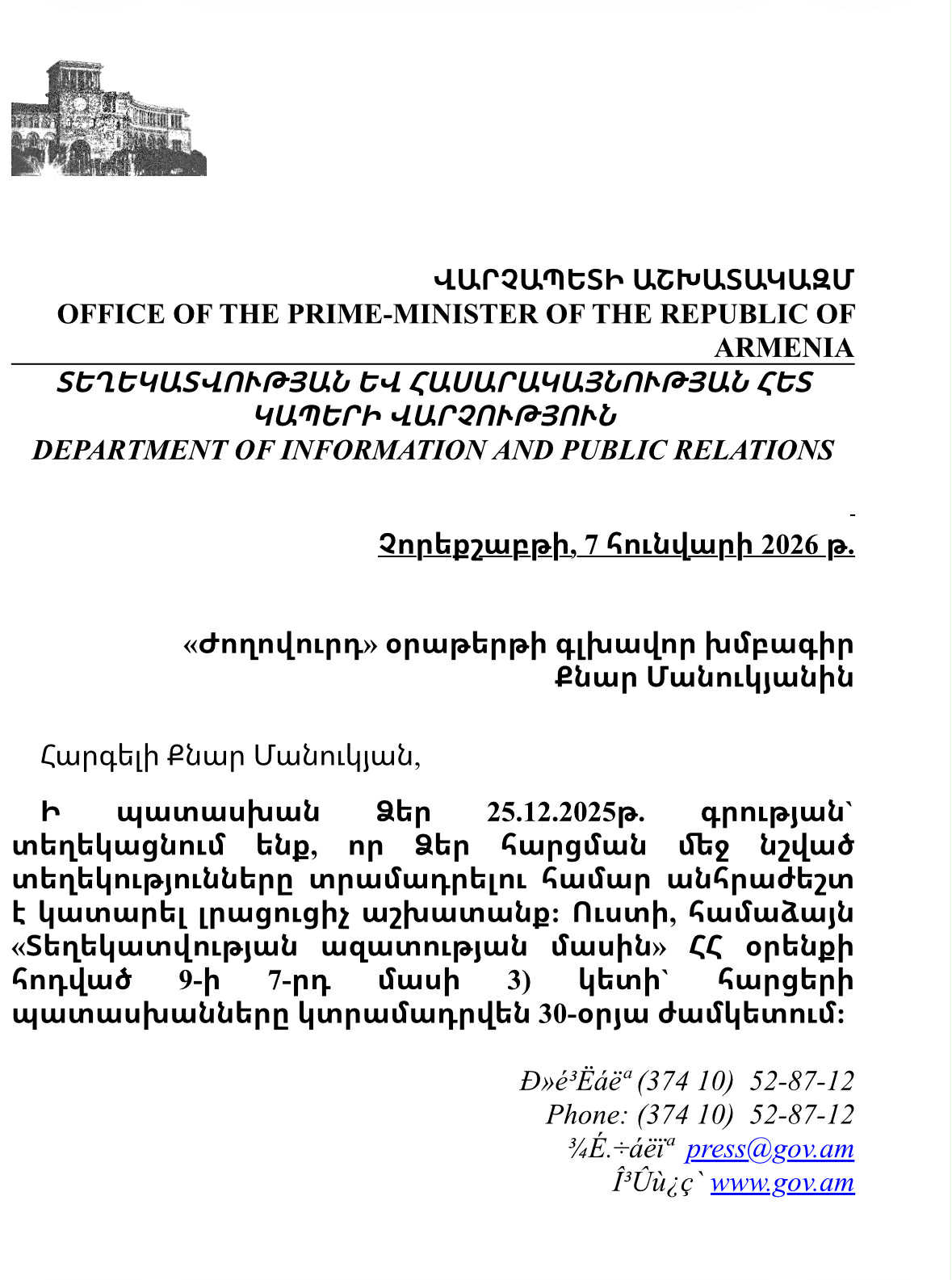 «Ժողովուրդ» օրաթերթը դեռ 2025 թվականի դեկտեմբերի 25-ին ՀՀ վարչապետի աշխատակազմի ղեկավար Արայիկ Հարությունյանին գրավոր հարցում էր ուղարկել՝ խնդրելով հայտնել, թե դեկտեմբեր ամսին նախարարներն ու փոխնախարարները որքան գումար են ստացել՝ որպես պարգևավճար և հավելավճար (տես 1-ին լուսանկարը)։ Հունվարին՝ տոներից հետո, Կառավարությունը ժամանակ էր խնդրել 30 օրով՝ հարցին պատասխանելու համար(տես 2-րդ լուսանկարը)։
