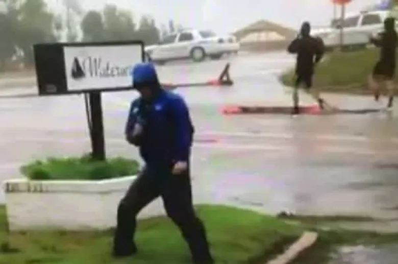 Տեսանյութում երևում է, թե ինչպես է հաղորդավար Մայք Սեյդելը Հյուսիսային Քարոլինայի Վիլմինգթոն քաղաքում պատմում փողոցում եղանակի մասին՝ պաշտպանվելով քամու ուժեղ հոսանքներից և անձրևից և մի կերպ կանգնած մնալով իր տեղում: Ռեպորտաժում, սակայն, որոշ ժամանակ անց նրա հետևում երկու երիտասարդ է երևում, որոնք թեթև շորերով են և սովորական արագությամբ քայլում են՝ ասես եղանակը բոլորովին նրանց վրա չի ազդում: