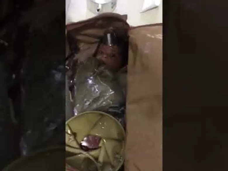 Տեսագրությունում երևում է՝ ինչպես են տերմինալի աշխատակիցները բացում կաշվե պայուսակը և իրերի կույտի տակից նորածին երեխայի դուրս բերում: