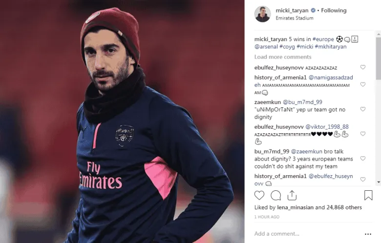 Հայաստանի ազգային հավաքականի և «Արսենալի» կիսապաշտպան Հենրիխ Մխիթարյանը Եվրոպա լիգայի խմբային փուլի 6-րդ տուրում ադրբեջանական «Ղարաբաղի» նկատմամբ իր թիմի տարած հաղթանակից հետո գրառում է կատարել Instagram-ում:
