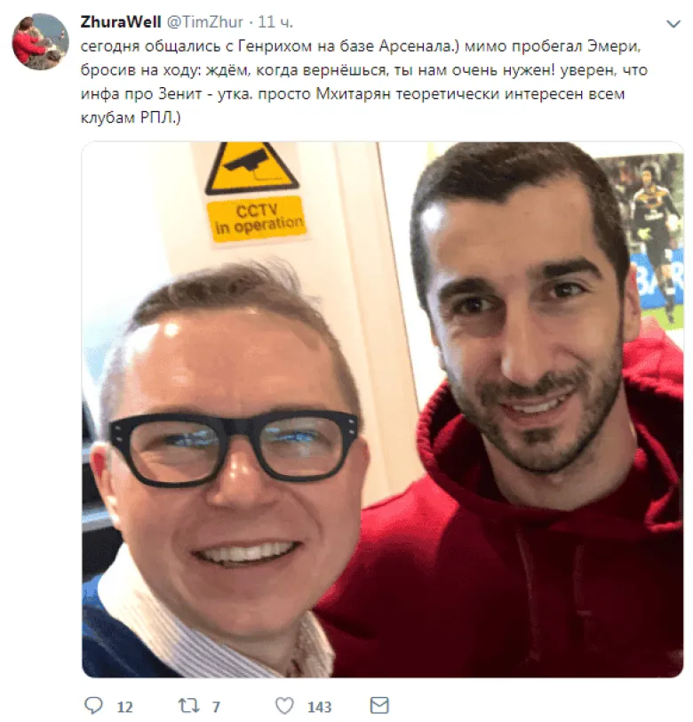 Матч ТВ-ի մեկնաբան Տիմուր Ժուրավելը «Թվիթերի» իր էջում լուսանկար է հրապարակել Հայաստանի ազգային հավաքականի և «Արսենալի» կիսապաշտպան Հենրիխ Մխիթարյանի հետ, ում հանդիպել է լոնդոնյան ակումբի մարզաբազայում: