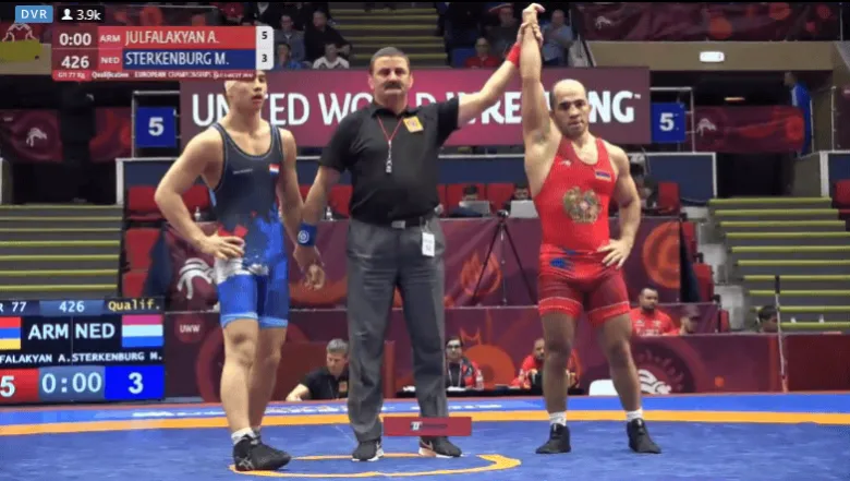 77 կգ քաշային կարգում Հայաստանը ներկայացնող Արսեն Ջուլֆալակյանը պայքարը սկսել է որակավորման փուլից, որտեղ 5:3 հաշվով առավելության է հասել Հոլանդիայի ներկայացուցիչ Մարսել Ստերկենբուրգի նկատմամբ: