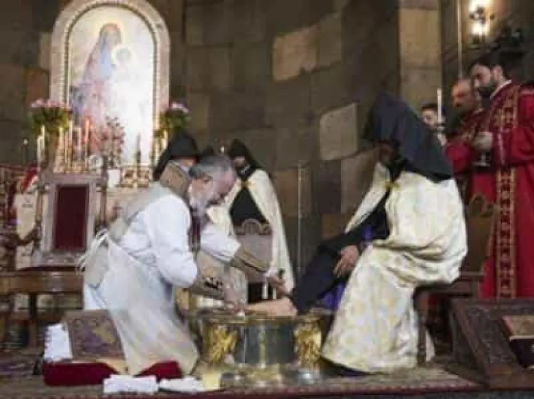 Այնուհետեւ Վեհափառ Հայրապետի ձեռամբ օրհնվել են խորանի վրա դրված ջուրն ու յուղը, որից հետո Նորին Սրբությունը ծնրադիր լվացել եւ յուղով օծել է տասներկու անձանց ոտքերը: