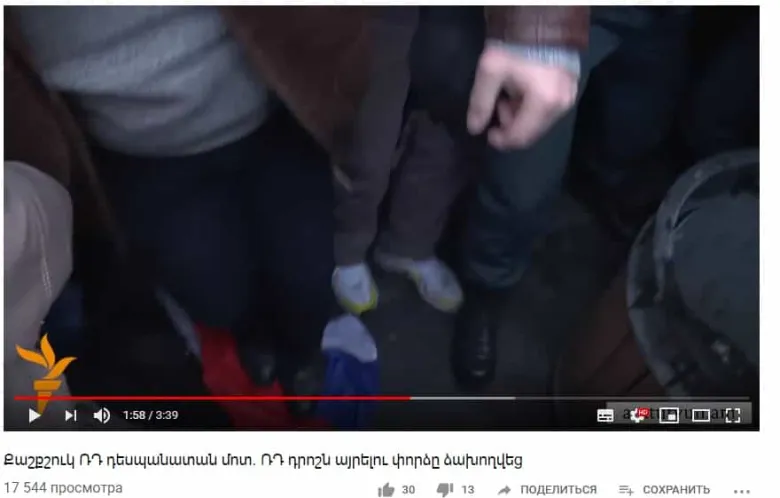Խոսքը Արագածոտնի մարզպետ Դավիթ Գևորգյանի մասին է։ Նա ժամանակին Հայաստանում ՌԴ դեսպանատան դիմաց կազմակերպվող բողոքի ակցիաների մասնակից էր։ Դավիթ Գրիգորյանն ու իր ընկերը չորս տարի առաջ դեսպանատան առաջ փորձեցին այրել ՌԴ պետական դրոշը, իսկ երբ ոստիկանները փորձեցին կանխարգելել այն, Գրիգորյանը ՌԴ դրոշը նետեց գետնին և կոշիկները սրբեց վրան։
