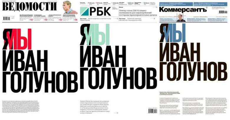 Երկուշաբթի օրը «России РБК», «Коммерсант» և «Ведомости» հայտնի պարբերականները պատմության մեջ առաջին անգամ լույս կտեսնեն միևնույն շապիկով` ի պաշտպանություն «Մեդուզա» պարբերականի հետաքննող լրագրող Իվան Գոլունովի, որի նկատմամբ կիրառվել է տնային կալանք` թմրամիջոցներ վաճառելու կասկածանքով: Այս մասին հայտնում է RIA Novosti-ն: