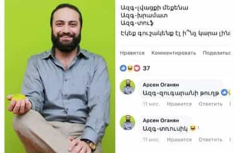 Փաստորեն, պաշտոնավարմանը զուգահեռ՝ Արսեն Օհանյանն անկաշկանդ ակտիվիստ է մնացել նաեւ հրապարակային դաշտում: Մի քանի րոպեներում ի մի ենք բերել գրառումների, թերեւս, ավելի ցցուն օրինակները, իսկ դրանք չափազանց շատ են, եւ որքան էլ զարմանալի թվա՝ սեռաքաղց գրառումներով պաշտոնյան հրապարակային դաշտում ինքնադրսեւորվել է նաեւ այս օրերին, երբ վարչապետի ապարատում իրեն՝ որպես պետական ծառայող, հնարավոր է՝ տնտղում են, որպեսզի օբյեկտիվ որոշում կայացնեն:
