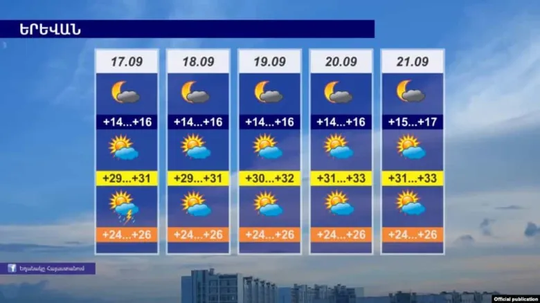 Այսօր երեկոյան ժամերին Երևանի առանձին հատվածներում հնարավոր է կարճատև անձրև և ամպրոպ, ամպրոպի ժամանակ հնարավոր է քամու ուժգնացում։ Սեպտեմբերի 18-21-ը սպասվում է առանց տեղումների եղանակ: