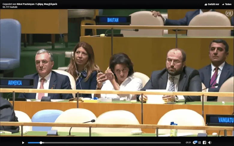 ՀՀ ԱԳ նախարար Զոհրաբ Մնացականյանը չդիմացավ եւ դիտողություն արեց Աննա Հակոբյանին, որը ամուսնու՝ Նիկոլ Փաշինյանի ելույթի ժամանակ ՄԱԿ-ի Գլխավոր ասամբլեայի նիստերի դահլիճում զբաղված էր մազերի հարդարմամբ:
