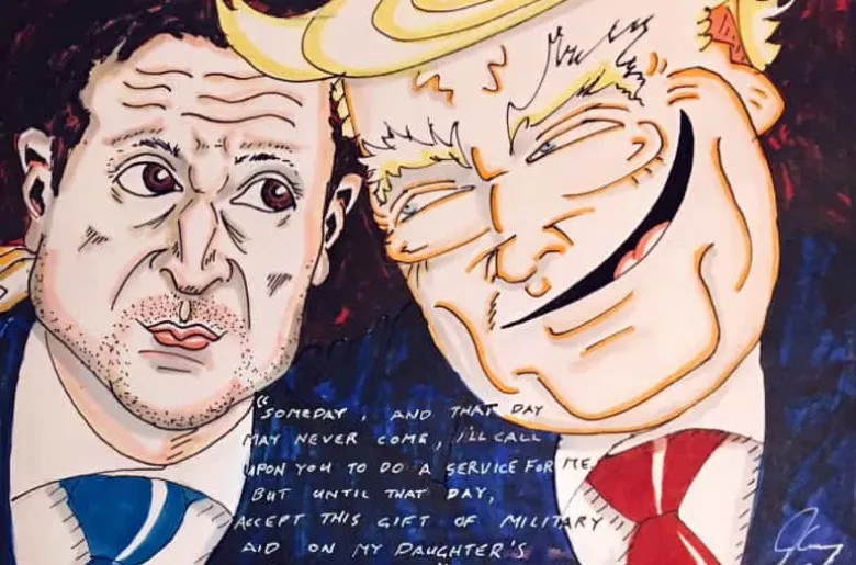«Չարագործությունների հայրն «առաջարկ» է արել «Զելենսկիին», որից անհնար է հրաժարվել»,- նկարը մակագրել է Քերին: Ծաղրանկարում Թրամփը Զելենսկիին է դիմում «Կնքահայրը» հայտնի ֆիլմի հերոսի խոսքերով` ակնարկելով, որ Ուկրաինայի առաջնորդն օրերից մի օր օգնության կարիք կունենա. «Ինչ-որ մի ժամանակ, հնարավոր է` այդ օրը երբեք չգա, ես քեզանից ծառայություն կխնդրեմ, բայց մինչ այդ ռազմական օգնության տեսքով ընդունիր այս նվերն աղջկաս հարսանիքի օրը»: