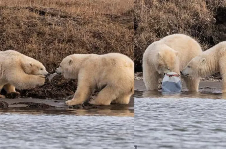 Լուսանկարների հերոսները բևեռային արջի երկու ձագերն են, որոնք կռվում են ափ նետված պլաստիկե աղբի համար: