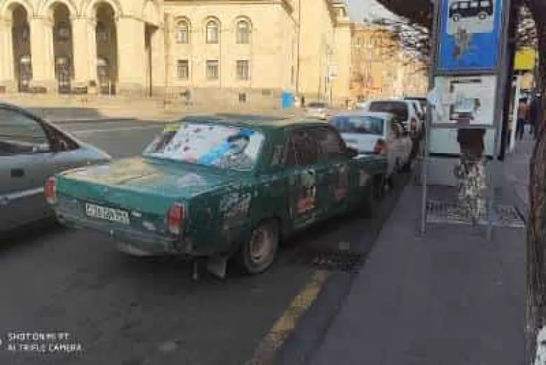 Մեքենայի ապակիներին ՀՀԿ-ականների նկարներ են՝ վրաները խաչ քաշած ու գրած՝ «ազգի դավաճան»։ Հետեւի ապակուն Նիկոլ Փաշինյանն է՝ հեղափոխական լոզունգներով։