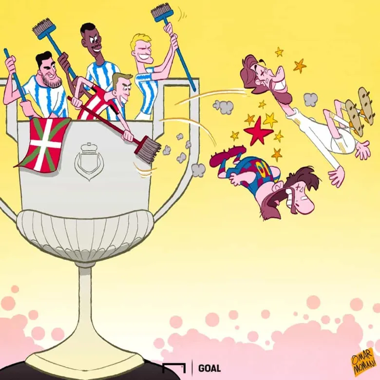 Մարզական աշխարհում հայտնի ծաղրանկարիչ Օմար Մոմանիի հերթական աշխատանքը նվիրված է Իսպանիայի գավաթի խաղարկությունից դուրս մնացած կատալոնական «Բարսելոնային» և Մադրիդի «Ռեալին»: