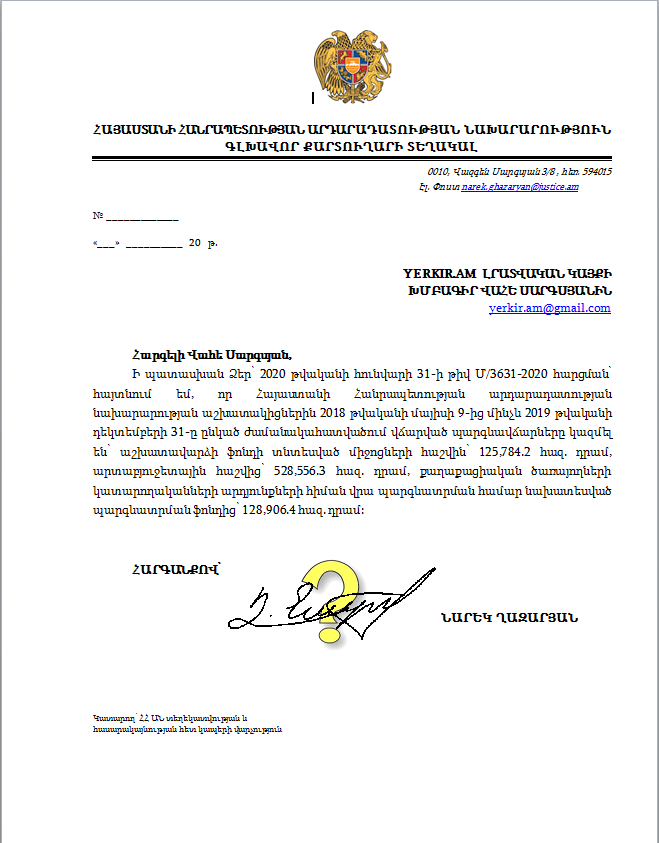 Yerkir.am-ը գրավոր հարցում էր ուղարկել ՀՀ արդարադատության նախարար Ռուստամ Բադասյանի անունով՝ խնդրելով տեղեկություններ այն մասին, թե որքա՞ն է կազմել հիմնարկի աշխատակիցներին վճարված պարգևավճարների չափը՝ 09.05.2018 թվականից մինչև 31.12.2019 թվականը: