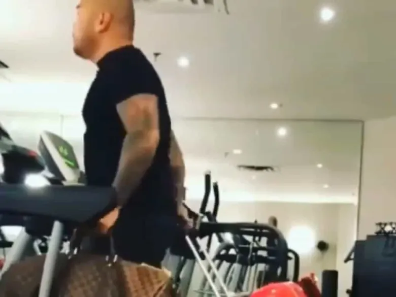 Տեսանյութում երեւում է, թե ինչպես է սպորտային հագուստով տղամարդը ճամպրուկներով վազում վազքուղով: Պարբերաբար նա նայում է ժամացույցին: Այդ ամենը տեղի է ունենում մարզադահլիճում կարանտինի ժամանակ: