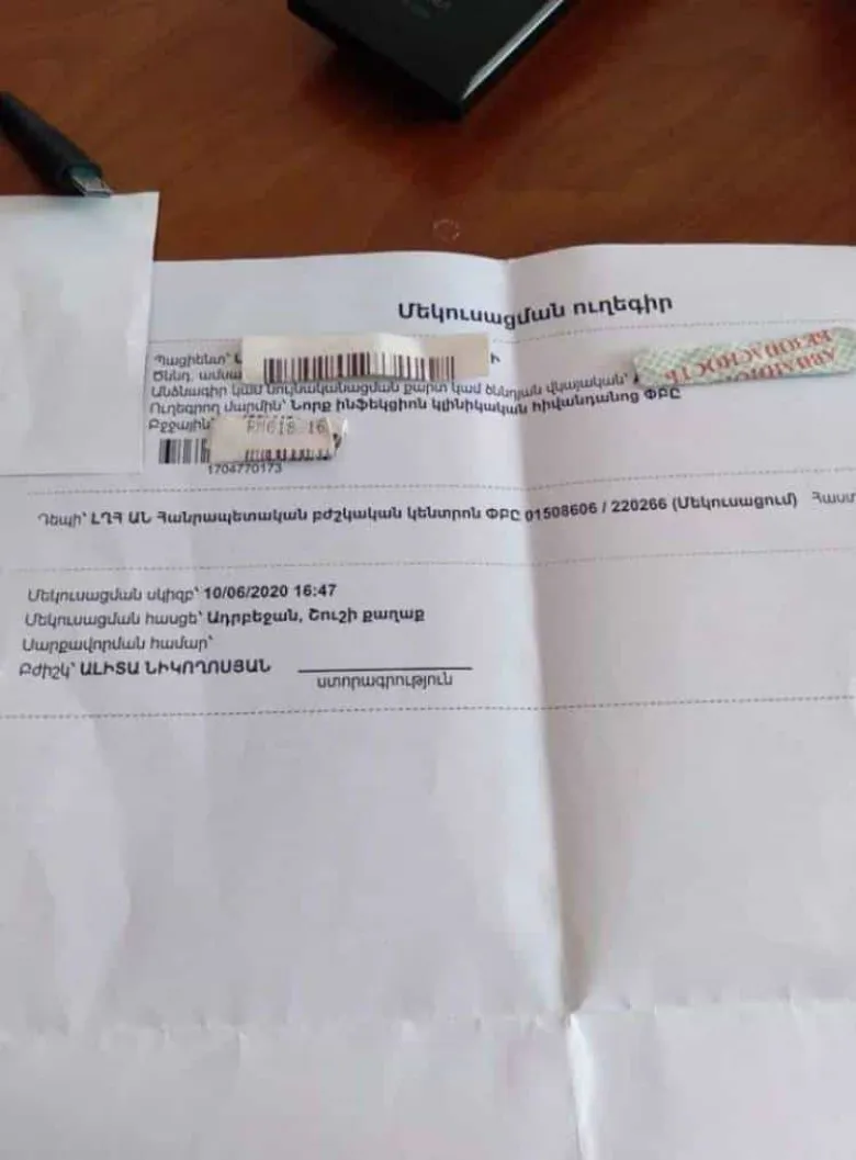 Hraparak.am-ը հայտնում է, որ Նորքի ինֆեկցիոն կլինիկական հիվանդանոցը Ռուսաստանից ժամանակ արցախաբնակ ՀՀ քաղաքացուն ուղեգրել է մեկուսանալու Շուշիի հիվանդանոցում՝ ուղեգրի վրա նշելով. «Մեկուսացման հասցե՝ Ադրբեջան, Շուշի քաղաք»։ Այս մասին լուսանկարը լայնորեն տարածվում է համացանցում, ի սկզբանե այն տեղադրված է եղել «Սասնա ծռերի» ֆեյսբուքյան էջում։