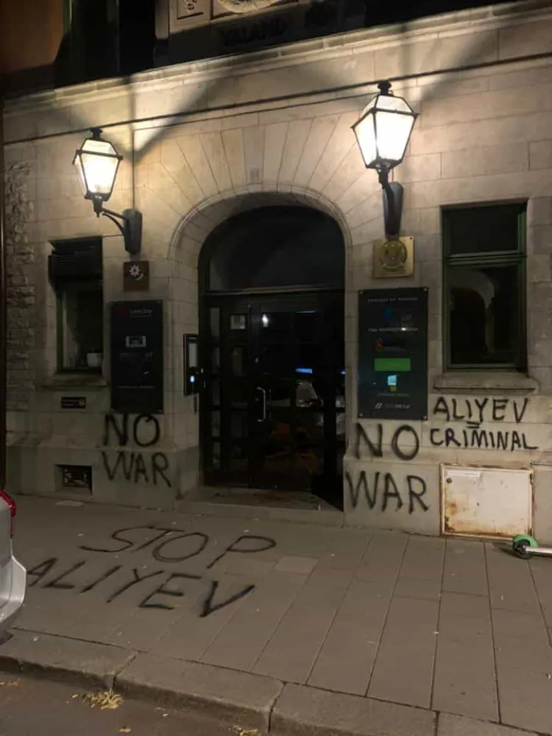 Ստոկհոլմում Ադրբեջանի դեսպանատան ճակատային հատվածին և հատակին մակագրվել են «Ո՛չ պատերազմին» և «Stop Ալիև» վանկարկումները