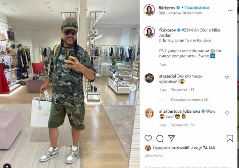 Լուսանկարում, որն արվել է լյուքս դասի նորաձեւության տան բուտիկում, նկատելի է, որ Կիրկորովը «զինվորական» նախշերով հագուստ է կրում, սպիտակ ու մոխրագույն մարզակոշիկ, որը զարդարված է Dior-ի մոնոգրամայով։ «Վերջապես դրանք հայտնվեցին ինձ մոտ»,- հրապարակման մեկնաբանություններում գրել է կատարողը։