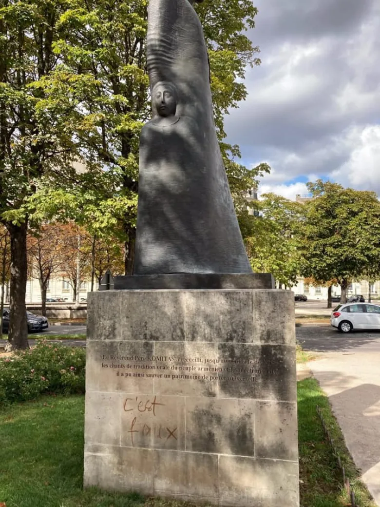 Փարիզում Հայոց ցեղասպանությունը խորհրդանշող` Կոմիտասի արձանի վրա գրել են «Կեղծիք է»»,-գրել է նա եւ տեղադրել հուշարձանի լուսանկարը: