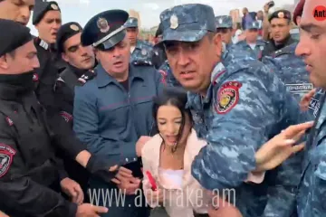 Ոստիկանները քաշքշելով բերման են ենթարկում մայթին կանգնած ցուցարարներին